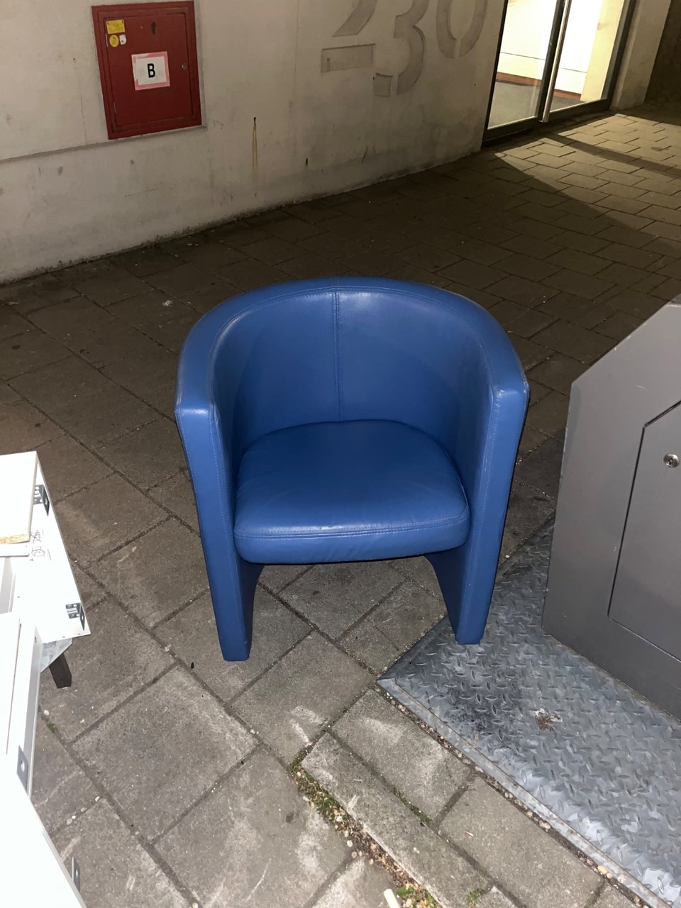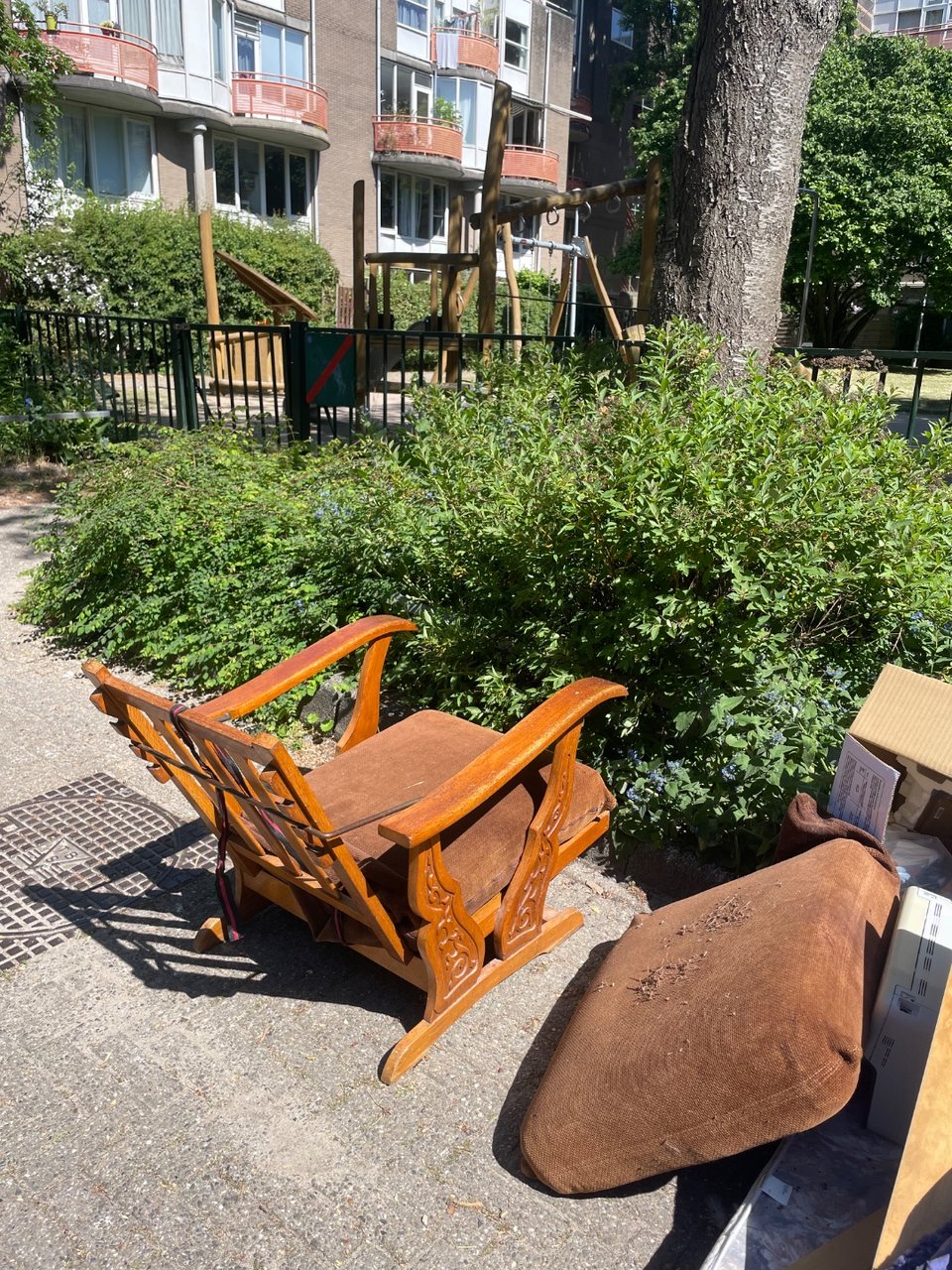 Indoor chair, outdoor chair, door and a nice wooden box that needs some love